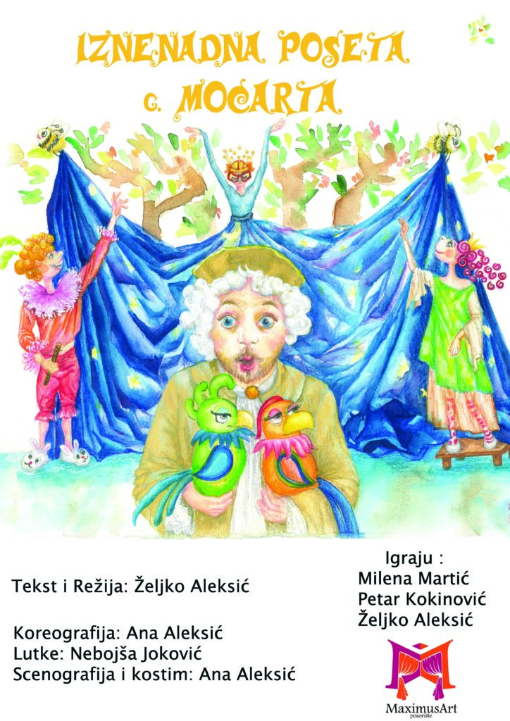 Predstava za decu “ Iznenadna poseta g. Mocarta“ govori o važnosti muzike i umetnosti u svakodnevnom životu. Dečak Vuk i njegova školska drugarica Ana uče o Mocartu i spremaju se da krenu u školu. U tom trenutku pronalaze veliki violinski ključ na prozoru i vrlo brzo posle toga pojavljuje se pravo iz prošlosti g. Mocart . Pored prepoznatljivih kompozicija i operskih melodija, ova predstava na jedinstven način priča radnju „ Čarobne frule „ koja ima moć da tugu pretvori u radost, baš kao i muzika. Koristeći svoju maštu i kreativnost Vuk i Ana uspevaju da pomognu Mocartu da na neočekivan i zanimljiv način završi priču svoje opere. Likovi naše predstave su princ Tamino, princeza Pamina, papagaji Papageno i Papagena,Kraljica Noći, i svi oni opisuju par magičnih događaja u jednom dalekom kraljevstvu. Spojili smo lutke, maske , igru , veselu muziku i tako neobičnu priču pretvorili u magičnu avanturu.
